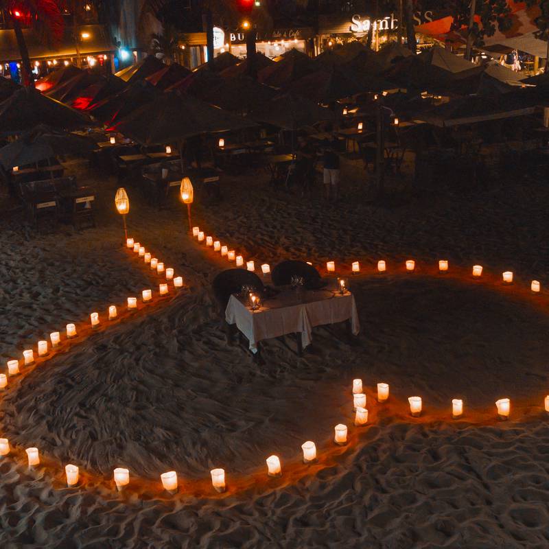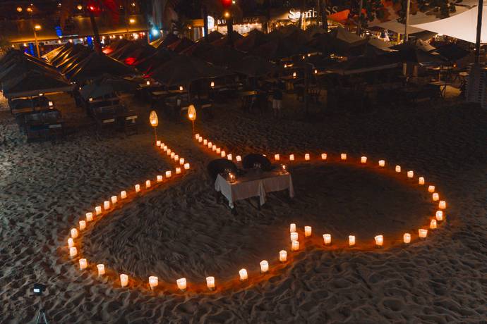 Neste jantar, vocês têm direito a uma mesa temática com coração de velas na areia e vista para o mar, além de atendimento exclusivo durante toda a sua estadia em nossa casa.